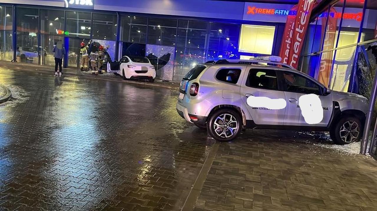 Najpierw kierowca tesli nie zapanował nad samochodem i uderzył w przeszkloną ścianę centrum handlowego. Włączył się alarm, na miejsce przyjechali pracownicy firmy...