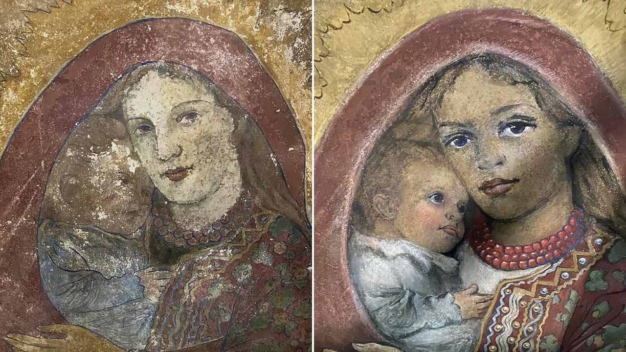 Dwa zdjęcia jednego malowidła: na jednym Maryja ma pociągłą twarz i wąskie oczy, na drugim - znacznie większe i wyraźnie zarysowane. To efekt konserwacji polichromii "Matka...