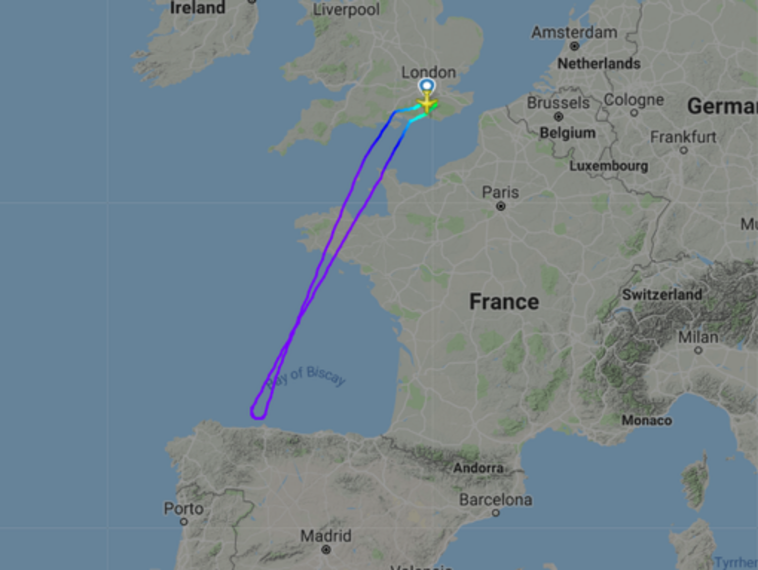 Przeleciał nad Francją i prawie dotarł do wybrzeża Hiszpanii, zanim nagle został zmuszony do zawrócenia, co oznacza, że samolot był w powietrzu prawie trzy godziny przed pojawieniem się problemu.