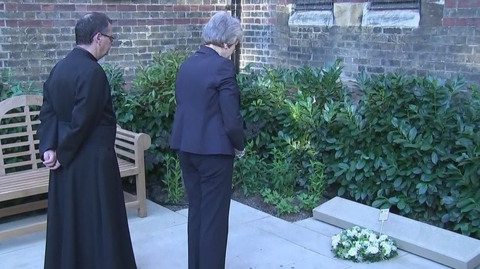 Premier May złożyła wieniec przed kościołem i zatrzymała się w chwili zadumy, zanim weszła na wieczorne nabożeństwo.